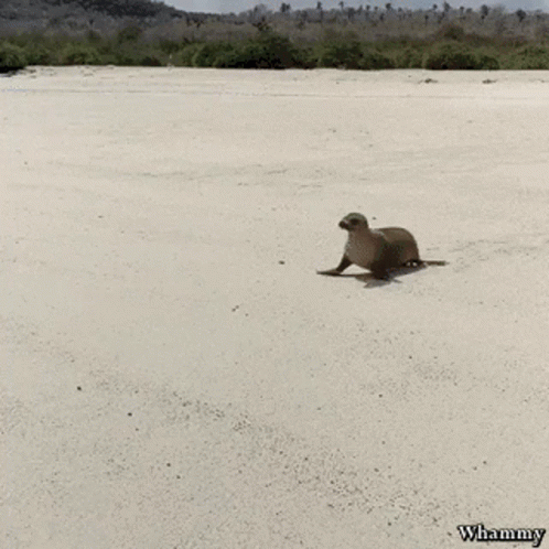 A sea lion wiggles across a sandy beach towards the water, with 'Whammy' text.