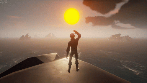 A character from Sea of Thieves stands on a ship's bow, reaching towards the setting sun over the ocean.