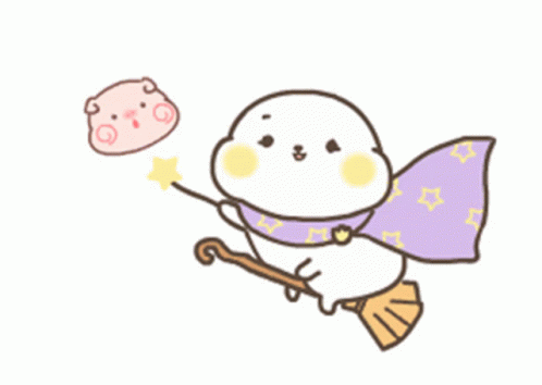Cute cartoon seal character Hibo, wearing a cape and holding a magic wand, flies on a broomstick.