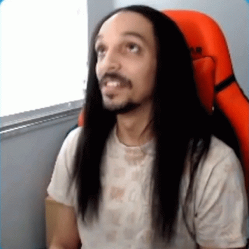 Bryant Benzing, a man with long hair and a beard, looks up and gestures while sitting in an orange gaming chair.