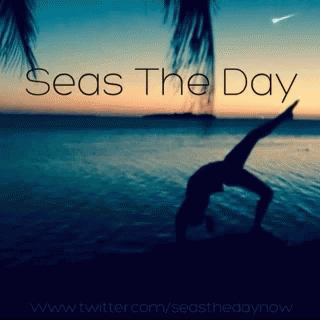 A person doing a handstand on a beach at sunset, with a shark fin appearing, captioned 'Seas The Day'.