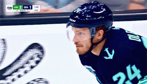 Jamie Oleksiak, a Seattle Kraken hockey player, on the ice during a game, wearing his number 24 jersey and helmet.