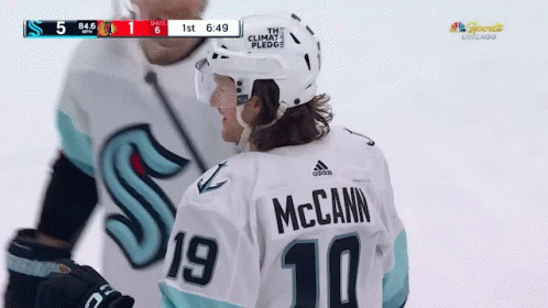 Jared McCann of the Seattle Kraken celebrates scoring a goal with his teammates, including Larsson.