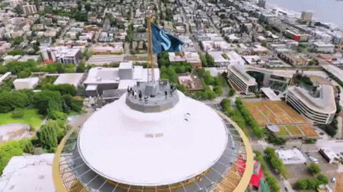 Aerial view of the Seattle Kraken flag proudly flying atop the iconic Space Needle in Seattle.