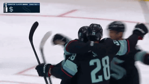 Seattle Kraken's Matty Beniers celebrates a goal with teammates during the Stanley Cup Playoffs.