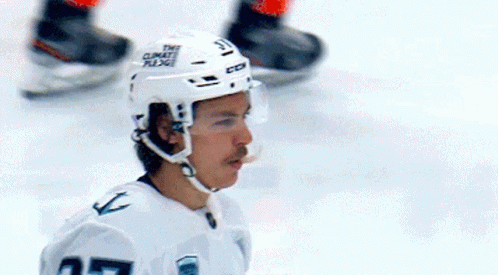 Seattle Kraken player Yanni Gourde on the ice, wearing his helmet with 'The Climate Pledge' sticker.