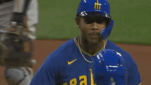 Julio Rodriguez and a Seattle Mariners teammate celebrate on the baseball field after a play.