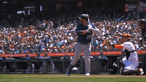 Seattle Mariners player Mike Ford swings his bat during a baseball game in a stadium.