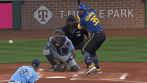 Teoscar Hernandez of the Seattle Mariners at bat, preparing to hit the baseball during a game at T-Mobile Park.