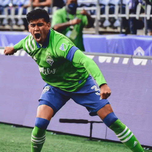 Xavier Arreaga celebrates a goal for Seattle Sounders FC with a teammate.