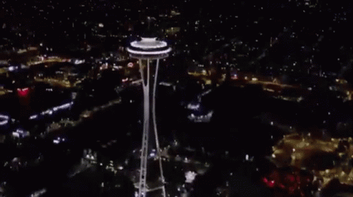 An impressive aerial view of the iconic Seattle Space Needle at night, surrounded by the illuminated city skyline.