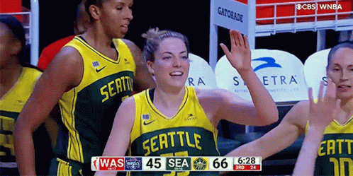 Seattle Storm player Katie Lou Samuelson celebrates with a high five during a WNBA game, wearing her team jersey.