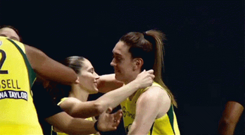 Seattle Storm players, including Sue Storm and Breanna Stewart, celebrate with a heartfelt hug after a game.