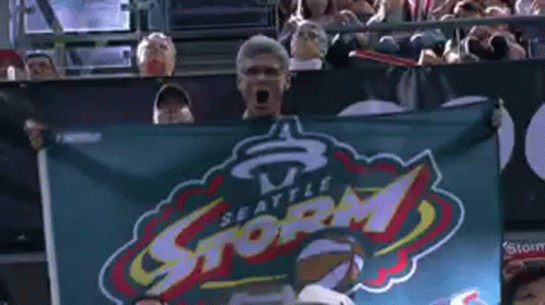 A passionate fan holds up a Seattle Storm WNBA banner and cheers loudly at a game.