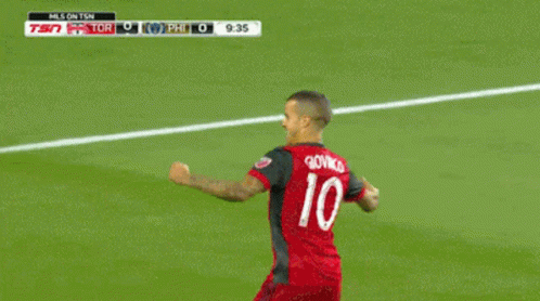 Sebastian Giovinco celebrates after scoring a goal for Toronto FC during an MLS match, putting them ahead 1-0.