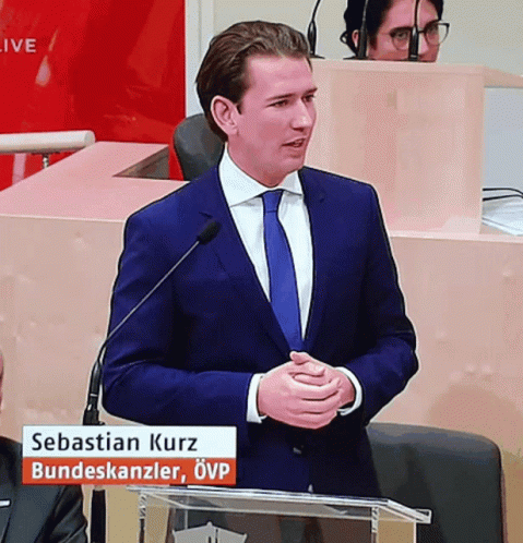 Austrian Chancellor Sebastian Kurz speaks at a podium, gesticulating during his address.