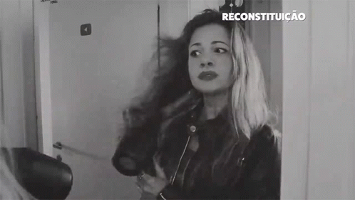 A woman from Drelacionamentos blow-dries her hair in front of a mirror, getting ready in a black and white scene.