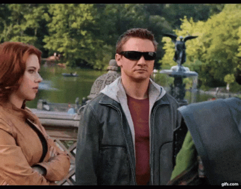 Hawkeye and Black Widow react to Loki's secret joke, with Hawkeye wearing shades and Loki looking on.