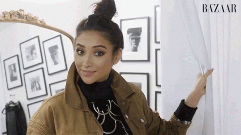 A woman playfully pulls back a white curtain, revealing herself for Harper's Bazaar.