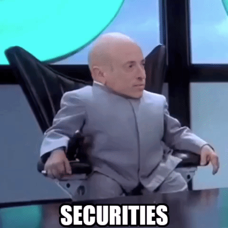 Gary Gensler's face superimposed on Mini Me, sitting in a chair with 'SECURITIES' text, making hand gestures.