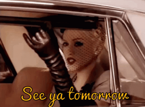 Madonna in a car, wearing a veiled hat and gloves, lowers the window with 'See ya tomorrow' text on screen.