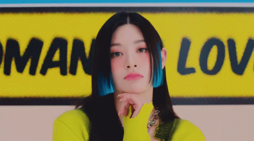 Stayc's Seeun showcases her striking black hair with vibrant blue streaks, posing in front of a yellow background.