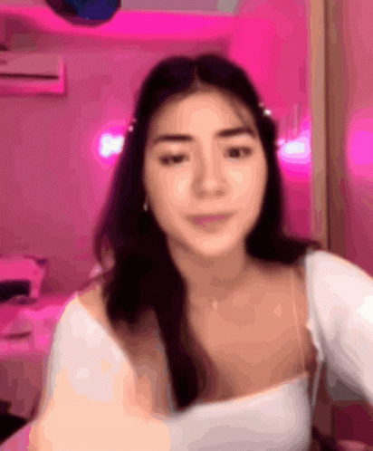 Seham Daghlas performs with hand gestures in a vibrant pink room with neon lights.