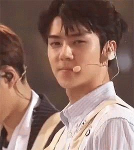 EXO's Sehun looks directly at the camera with a subtle smirk, wearing a light shirt and microphone.