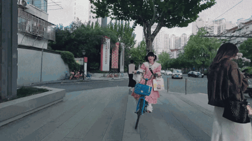 a woman in a pink dress is riding a bike down the street