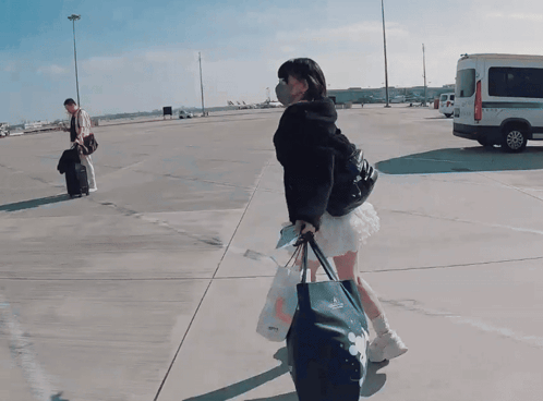 a woman wearing a mask carrying a bag that says ' abercrombie ' on it
