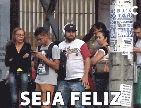Man with headphones dances happily in public, spreading joy with 'Be Happy' message.