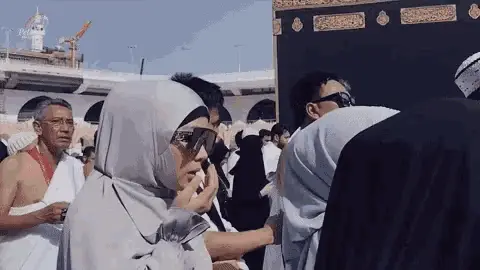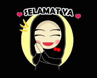 A cute Muslimah cartoon character with a hijab offers a 'Selamat Ya' greeting with clasped hands.