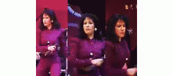 Selena Quintanilla performing a Cumbia Spin on stage in a dazzling purple outfit.