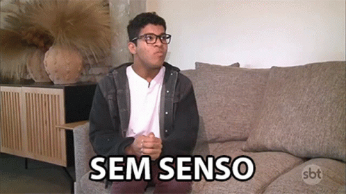 Young man with glasses on a couch, gesturing, with 'Sem Senso' text, implying a lack of fashion understanding.