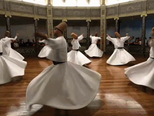 Whirling dervishes (Semazen) perform the spiritual Sema ceremony in a grand hall.