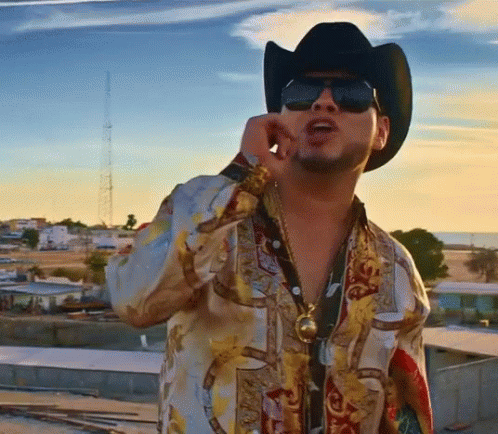 Lenin Ramirez in a cowboy hat and sunglasses, pointing to the sky, performing 'Señalando Al Cielo Te Lo Juro'.