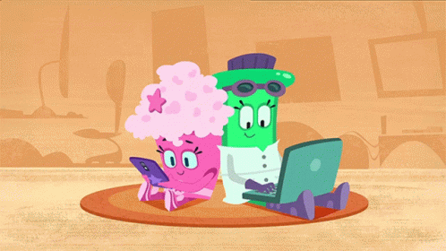 Alison and a friend, cartoon characters, sending love while using a laptop and phone.