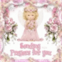 A sweet angel in a pink dress surrounded by roses, with the message 'Sending Prayers for you'.
