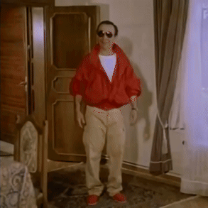 Turkish actor Şener Şen poses confidently in a red jacket and sunglasses, arms outstretched in a room.