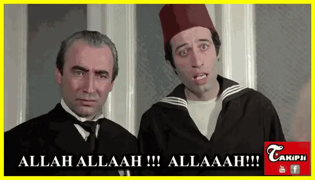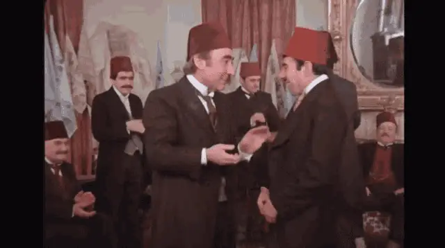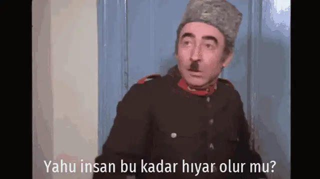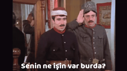 Şener Şen and İlyas Salman in military uniforms from the film Şekerpare, asking 'What are you doing here?'