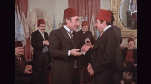 Şener Şen dancing in a scene from the Turkish film Şekerpare, surrounded by men in traditional fezzes.