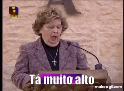 A woman at a podium on TVI exclaims 'Tá muito alto' (It's too high), likely referring to the microphone.
