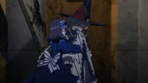 a couple of anime characters standing next to each other with one wearing a witch hat