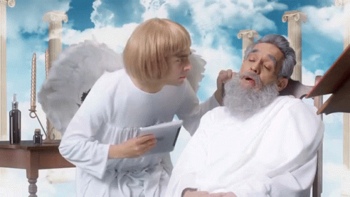An angel tries to wake up Senor Dios, who is asleep in his chair in a heavenly setting.