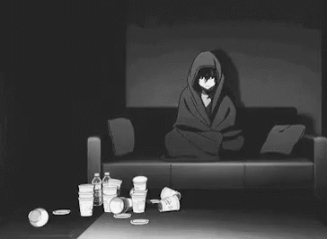 An animated person sits and lies on a couch, wrapped in a blanket, looking depressed with the caption 'I need friends'.