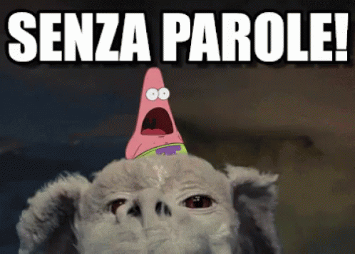 A dog with Patrick Star on its head, looking speechless and disbelieving, with the text 'Senza Parole!'.