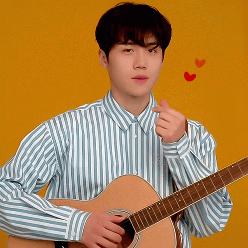 Kim Seon-ho plays guitar and makes a finger heart gesture, smiling brightly in a striped shirt.
