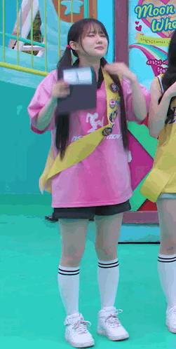 a girl in a pink shirt and white shoes is standing next to another girl in a yellow shirt .