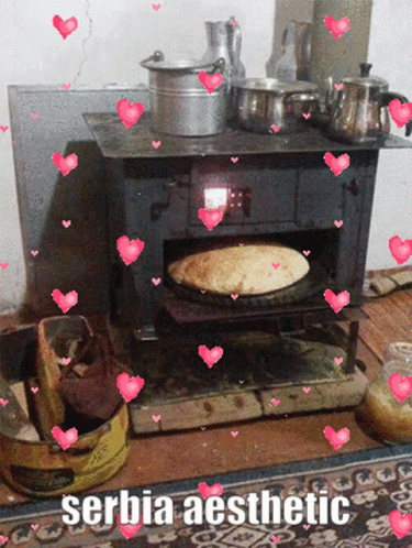 A rustic Serbian kitchen scene featuring a wood-burning stove with bread baking, enhanced with animated hearts.