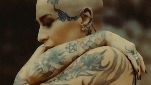 Nargiz Zakirova, with a shaved head and extensive tattoos, holds her arms across her chest in a contemplative pose.